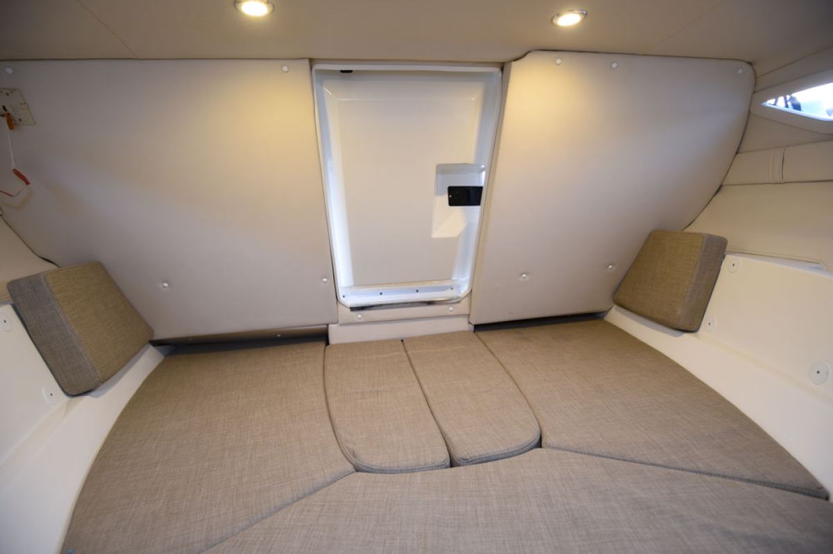 Den store kabine er særdeles rummelig grundet den specielle skrogform med bred front, samtidig med at den dybe v-form bibeholdes. Langsgående vinduer i begge sider giver ekstraordinært godt lysindfald. L-sofaen i cockpittet kan omdannes til en solplads samtidig med at den store solplatform agter kan bruges af to personer. Moderne og flot instrumentbord med plads til integreret 7" kortplotter. Båden leveres med selvlænssende cockpit som giver nem rengøring og høj sikkerhed specielt lavet til europæisk brug.