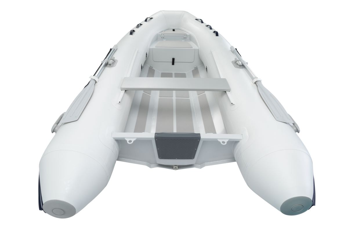 Udarbejdet i robust PVC med dobbelt skrog og plant gulv i selve gummibåden. Gulvet er monteret med skridsikre markeringer og agterspejlet er ekstra forstærket.